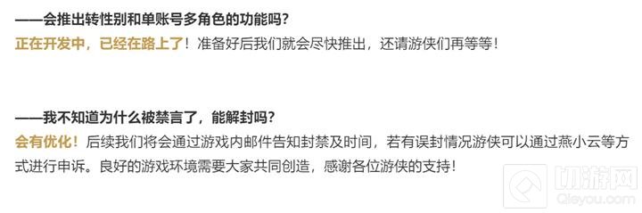 此外,游戏中AI助战队友挂机的问题已经得到修复。对于玩家提出的转性别和单账号多角色功能的需求,开发团队表示正在开发中,不久将与玩家见面。关于玩家被禁言的问题,游戏将通过邮件告知封禁原因及时间,若存在误封情况,玩家可以通过燕小云等方式进行申诉。良好的游戏环境需要大家共同维护。