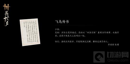 一封飞鸟传书带来了紧急的消息,江湖传说中“北投契丹”的河伯现已南还,形势危急,一场命定归来的激战即将在全新的大型镇守“天上来”开启。在杀机四伏的雨夜中,游侠们将与“线人”配合,深入渡口腹地,开启一场充满解谜和战斗的冒险。