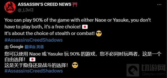 《刺客信条:影》这款游戏近期引发了众多玩家的讨论,尤其是关于其角色选择的设定。据游戏博主_L3vi3透露,游戏中大约90%的流程允许玩家自由选择扮演忍者奈绪江或黑武士弥助。