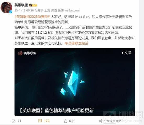 在英雄联盟新赛季中,官方对蓝色精粹获取进行了调整,目的是希望新玩家和休闲玩家能够有更显著的增长。但取得的效果却不尽人意,引发了玩家的热议,近日,《英雄联盟》官方发布公告,承认新赛季在蓝色精粹获取速率和账号等级经验获取速率方面的调整存在严重失误,并就此向玩家道歉,同时宣布将通过后续版本更新进行修复和补偿。
