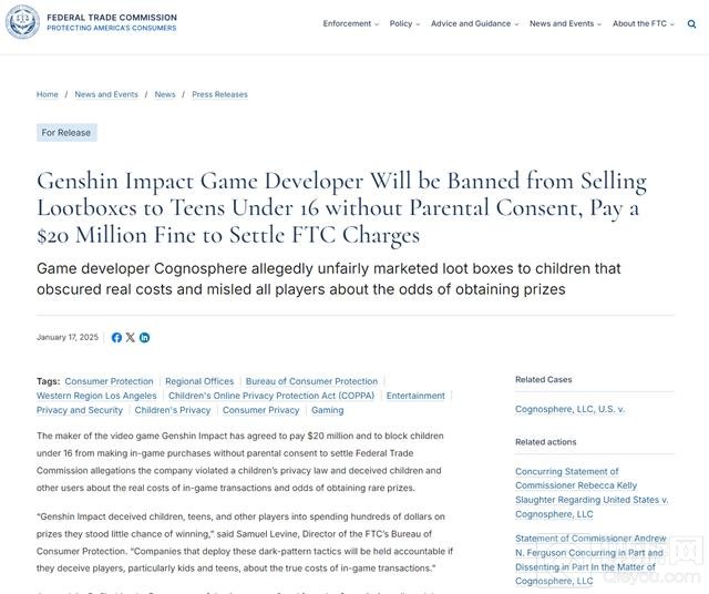 美国联邦贸易委员会(FTC)近日对《原神》开发商米哈游发起诉讼,指控其旗下游戏《原神》违反《儿童在线隐私保护法》,并最终达成和解。根据和解协议,米哈游在美国的运营主体Cognosphere公司需支付2000万美元罚款,并对其相关政策进行严格修改。