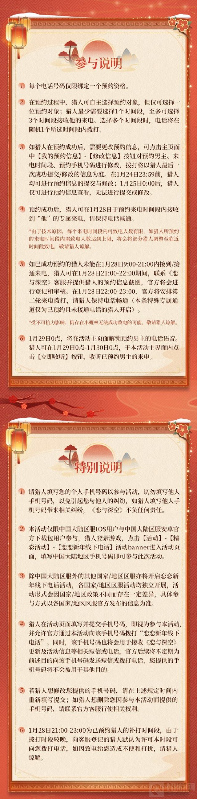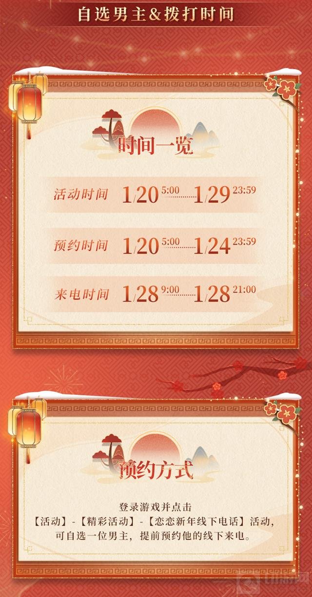 活动时间为1月20日5:00至1月29日23:59,其中预约时间为1月20日5:00至1月24日23:59,来电时间则安排在1月28日9:00至21:00。特别解锁时间为1月29日0:00至23:59,玩家可以在游戏内解锁并接听已预约男主的电话语音。