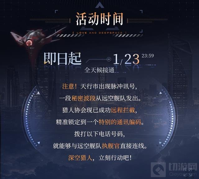 这次的热线活动是一次难得的机会,不仅能够与游戏中的重要角色——夏以昼进行互动,还能揭开一段隐藏的秘密。无论你是想深入了解远空舰队的幕后故事,还是体验一场充满悬念的追踪调查,都不容错过。拨打电话,探索未知,开启这场意外的冒险之旅。
