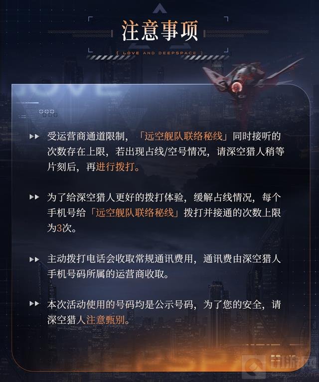 通话次数限制:为了确保更多的猎人能够体验这次活动,每个手机号每天最多只能拨打并接通「远空舰队联络秘线」三次。记得合理安排拨打时间,尽早抓住机会!