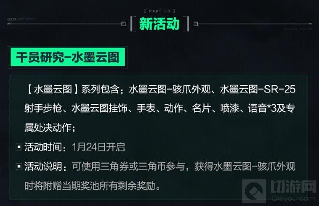 《三角洲行动》即将迎来一场与众不同的干员研究活动——【水墨云图】系列活动。这一系列内容将为玩家们带来众多独特的奖励,包括限量外观、武器皮肤、个性化装饰和更多内容。活动将于1月24日正式开启,同时为回馈广大玩家的热情,官方还对原活动内容进行了调整,带来了令人惊喜的改动和福利。接下来,让我们一起来了解详细的活动内容以及调整公告。