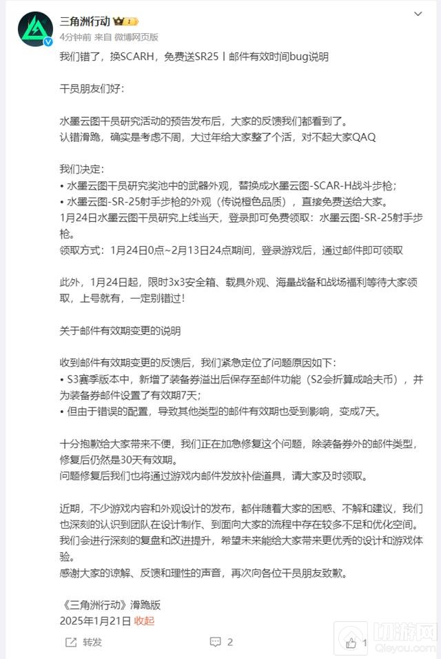 在活动预告发布后,玩家们反馈了关于邮件有效期的问题。官方紧急调查并确认了问题的原因:由于S3赛季版本中引入了装备券溢出保存至邮件的功能,错误的配置导致其他类型邮件的有效期被设置为7天。对此,官方向玩家们表示深深的歉意。