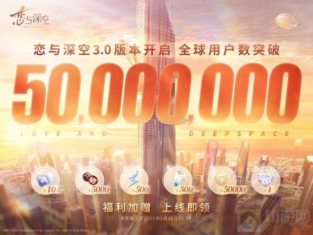 今日,《恋与深空》正式宣布全球用户数突破5000万大关,活跃用户数也持续攀升,刷新了新的记录!这一里程碑离不开全球猎人的支持与陪伴,为此,官方特别准备了一份丰厚的感谢礼物,以回馈广大玩家的热情参与。