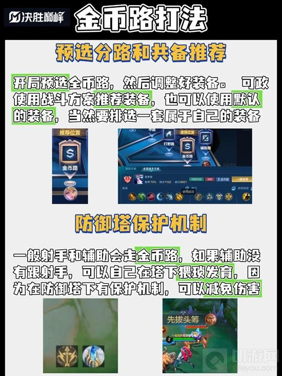 开局选择金币路后,优先调整装备配置。你可以选择系统推荐的装备,也可以根据个人习惯调整默认装备,挑选一套适合自己的装备组合。金币路通常由射手和辅助英雄搭配发育。如果辅助没有跟随射手,射手可以利用防御塔的保护机制,在塔下猥琐发育,减少受到的伤害。