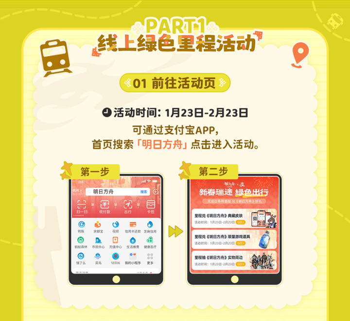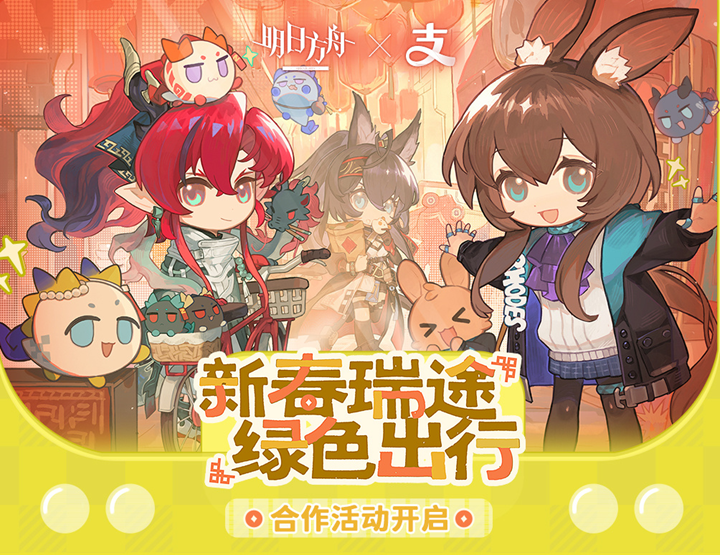 《明日方舟》与支付宝联合推出的「新春瑞途,绿色出行」合作活动正式上线,活动时间为1月23日至2月23日。参与者可以通过支付宝APP参与活动,获取绿色里程并兑换各种丰厚奖励。