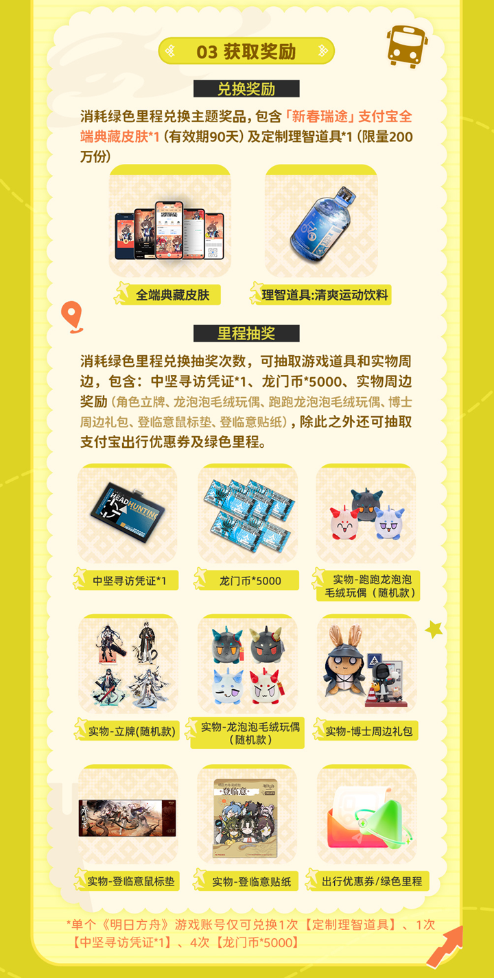 抽奖奖励:消耗绿色里程兑换抽奖次数,可抽取游戏道具、实物周边等奖励,包括:中坚寻访凭证*1、龙门币*5000、实物周边(如角色立牌、龙泡泡毛绒玩偶、跑跑龙泡泡毛绒玩偶、博士周边礼包、登临意鼠标垫、登临意贴纸等)、出行优惠券及绿色里程。