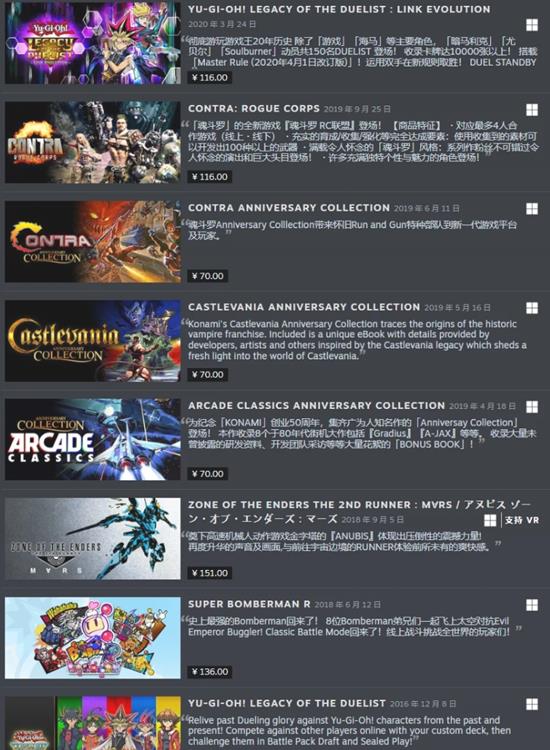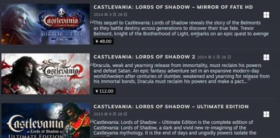 包括《恶魔城:暗影之王终极版》(88元)、《恶魔城:暗影之王2》(112元)和《恶魔城:宿命镜面HD》(48元)。