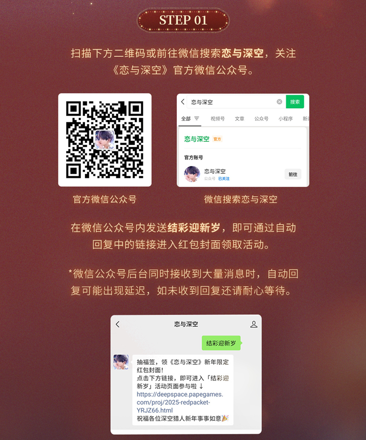 本次红包封面领取活动的时间从 2025年1月24日17:00 开始,到 1月27日16:59 结束。在活动期间,每天的 17:00 起将有限量发放红包封面,数量有限,先到先得,抢到即得。要参与领取,玩家只需前往《恋与深空》官方微信公众号,发送关键词 :