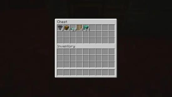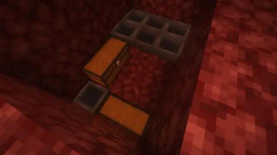跳入坑中,在其中一个较长边的中央放置一个箱子。在第一个箱子的左边放置第二个箱子,然后在地板上再放置一个双箱子。用漏斗连接这两个双箱子,这将是僵尸猪灵掉落的腐肉、金粒和其他物品的存放地点。