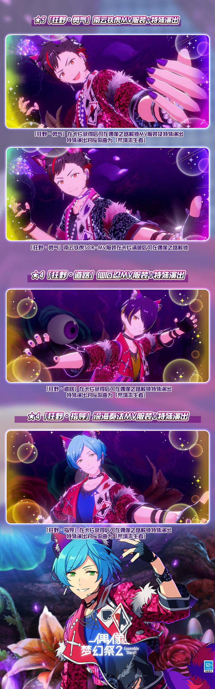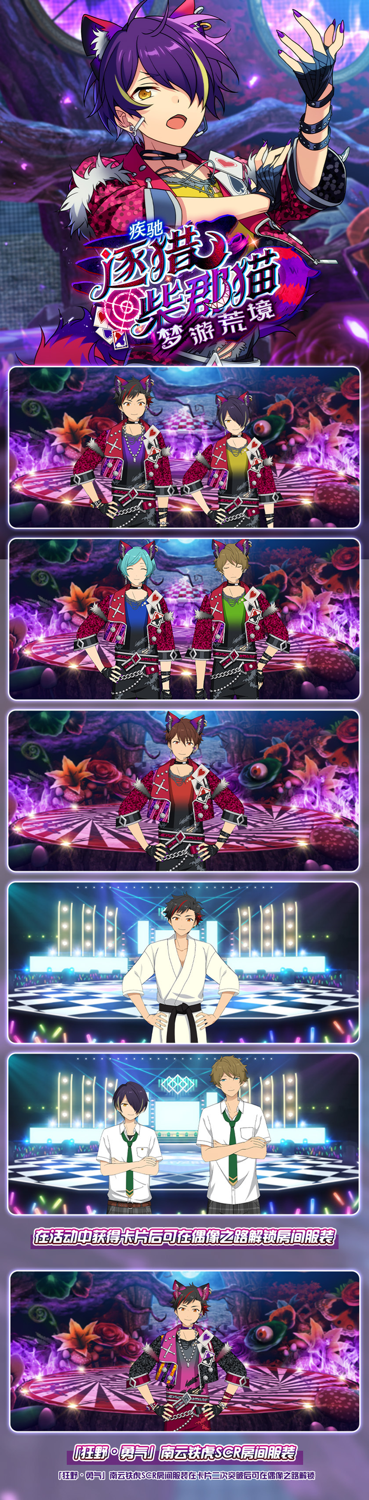 「偶像梦幻祭2」全新大型活动【疾驰◆逐猎・柴郡猫梦游荒境】将于2025年1月25日12:00正式拉开帷幕,持续至2月2日22:00。本次活动以《爱丽丝梦游仙境》为主题灵感,展现了一个失去秩序且荒废的狂野世界观,由组合「流星队」倾力演绎。担任队长的南云铁虎将带领团队克服挑战,为玩家呈现一场精彩的偶像冒险之旅!