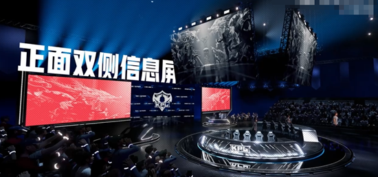 内场观众席采用阶梯式坐席,对战区域为环绕式的圆形舞台,舞台上安装三面吊装主屏和正面双侧信息屏,为粉丝创造更近、更全方位的观赛体验;