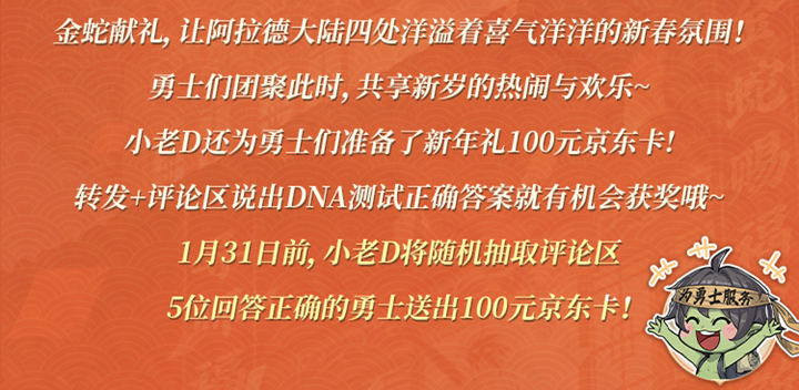 即日起至1月31日,勇士们可通过转发+评论区说出DNA测试正确答案的方式参与活动。1月31日前,小老D将随机抽取评论区5位回答正确的勇士送出100元京东卡。