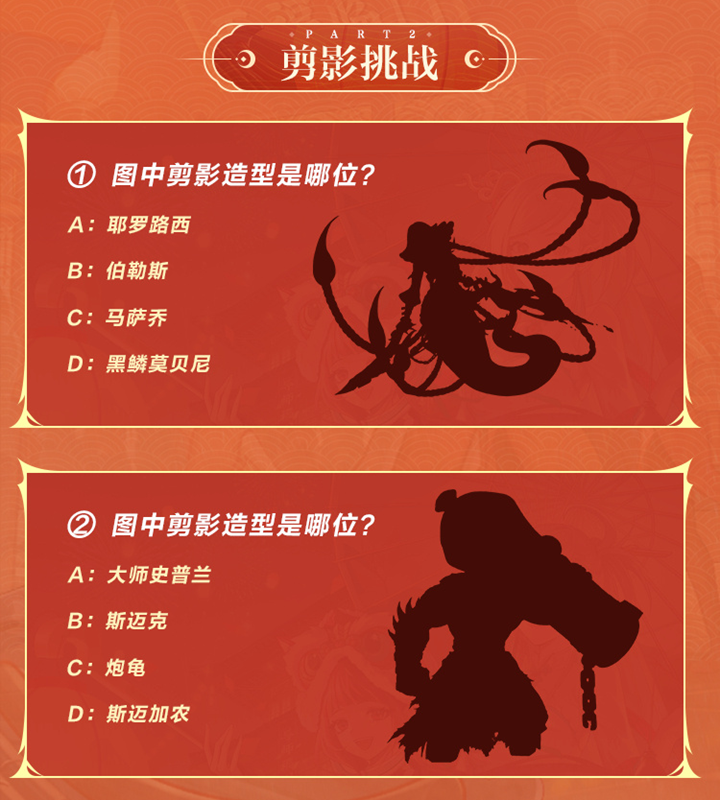 解析:此题需要玩家根据剪影的造型特征来判断是哪位角色。建议玩家仔细观察剪影的轮廓、服饰等特征进行判断。
