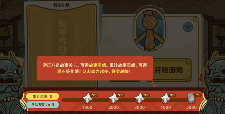 通关全部八奇故事,可领取奖励共计原石40、祝圣油膏3、大英雄的经验3、精锻用魔矿8、摩拉10000。故事灵感达到指定数量后,可领取奖励共计原石80、大英雄的经验*3。每日幸运签文分享,将获得累计 15000 摩拉奖励。首次生成关卡并分享,将获得 5000 摩拉奖励。
