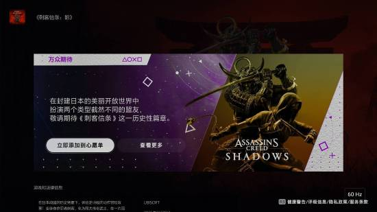 《刺客信条:影》将于3月20日发售,近日本作登上PS5商店首页,玩家选中PlayStation Store版块即可查看。