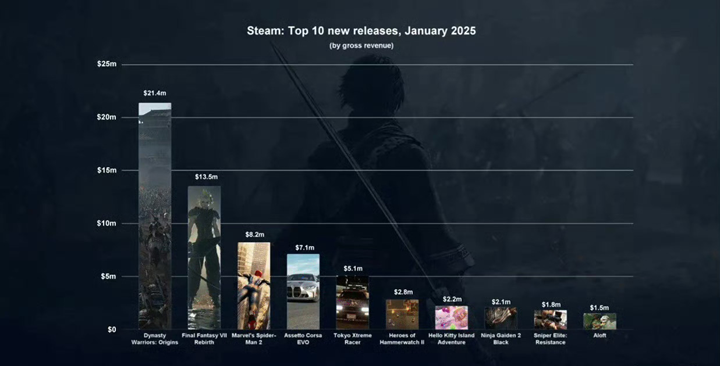 2025年1月Steam平台新游销售数据正式公布,光荣特库摩旗下动作割草新作《真三国无双:起源》以 2140万美元(约1.55亿元人民币) 的销售额强势登顶;紧随其后的是SE社经典IP续作《最终幻想7:重生》(1350万美元/约9789万元),以及漫威IP改编的《漫威蜘蛛侠2》(820万美元/约5946万元)。三款作品凭借IP号召力与玩法创新,共同拉动当月Steam新游市场热度。