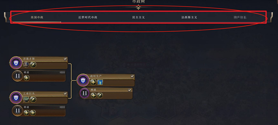 市政方面,7代为每个文明都加入了单独的市政树,随着市政的解锁来开启一些单个文明专属的效果与建筑。