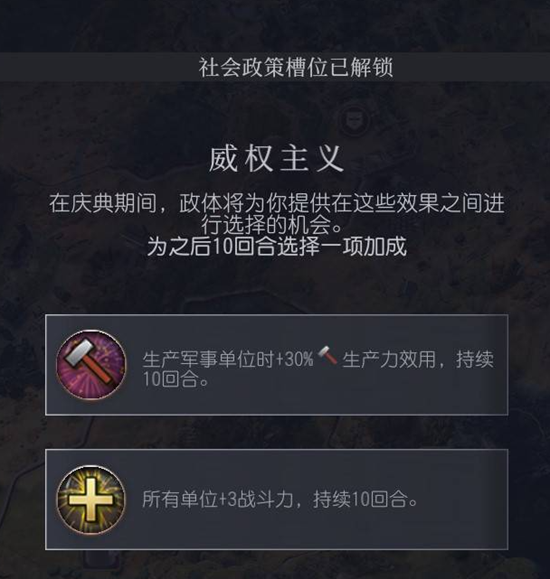 每过数个回合文明都会举行一次庆典,庆典则需要玩家选择此政体带来两种加成的其一。