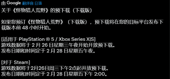 就在今天,《怪猎》官方发布了最新消息,本作的预载时间将在发售前48小时开放,也就是说,PlayStation 5和Xbox Series X|S平台将于2月25日晚11点开放下载,并在2月27日晚11点正式解禁。