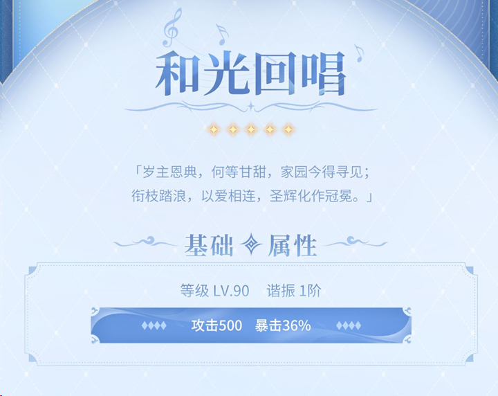 当「和光回唱」达到满级(LV.90)并处于谐振1阶时,它能提供500点攻击力以及30%的暴击率。这些数值使得「和光回唱」成为追求高爆发输出角色的理想选择。