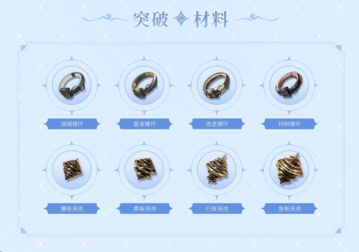 为了使「和光回唱」发挥出最大潜力,您需要收集一系列突破材料,包括但不限于简陋镣环、基准镣环、改造镣环、特制镣环以及不同类型的涡流材料(慢板涡流、柔板涡流、行板涡流、急板涡流)。