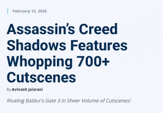 据外媒报道,育碧确认本作将包含700余段过场动画。这一数字使《刺客信条:影》接近了《博德之门3》等游戏的规模,后者的过场动画时长约为174小时。
