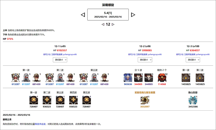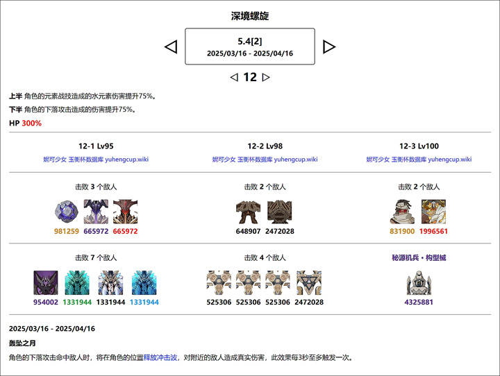 - 第十二层上半:角色的元素战技若造成水元素伤害,则该伤害会增加75%,适合那些能够频繁使用元素战技并产生水元素伤害的角色。