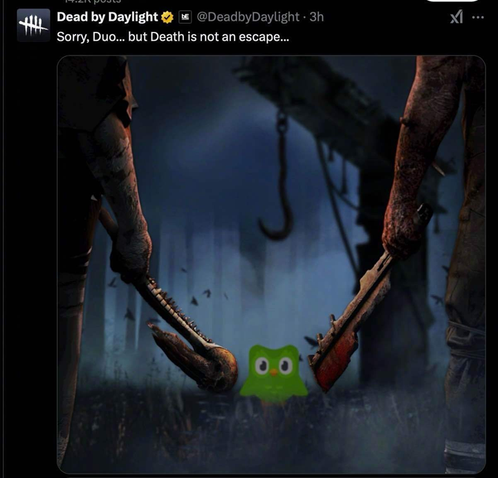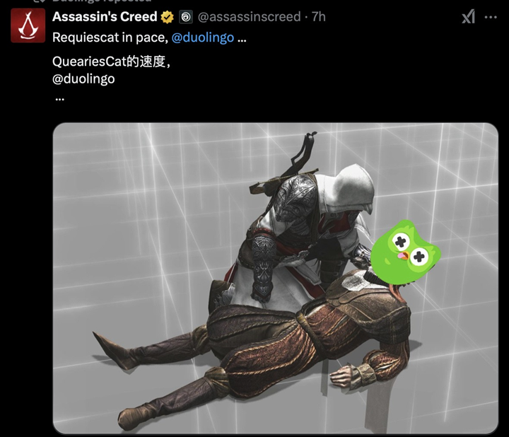 这些游戏品牌通过各自的社交媒体平台发布了关于Duo的“悼念”图,这不仅是对多邻国的一种支持,也是对互联网文化中幽默感和创意表达的认可。