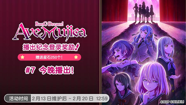 此外,为庆祝《BanG Dream! Ave Mujica/颂乐人偶》动画的播出,游戏内还同步开展了登录奖励活动。自2025年1月9日起,每周随着动画的播出,玩家登录游戏即可领取「星石×250」的奖励。