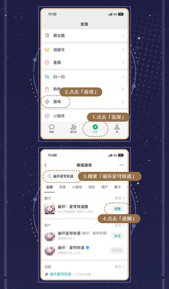 打开微信,点击导航栏中的「发现」-「游戏」,搜索“崩坏星穹铁道”,进入官方游戏圈。