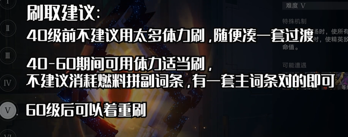遗器的刷取需要根据开拓等级分阶段进行:在40级前,由于掉落率较低,不建议投入过多体力刷遗器,只需为常用角色配备一套主属性正确的遗器即可,无需追求副词条;在40~60级期间,40级后稳定掉落1个金色遗器,50级后概率掉落2个金色遗器,此时保证常用角色有一套主属性正确的遗器即可,不建议消耗燃料拼副词条;而在60级后,稳定掉落2个金色遗器,此时可以开始优化遗器,追求更好的副词条和套装效果。