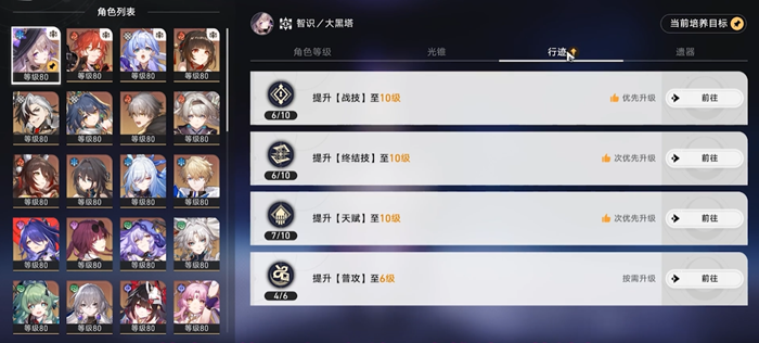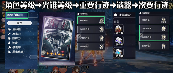 最后,次要行迹的优先级较低,可以在资源充裕时逐步升级,主要用于进一步提升角色的综合能力。
