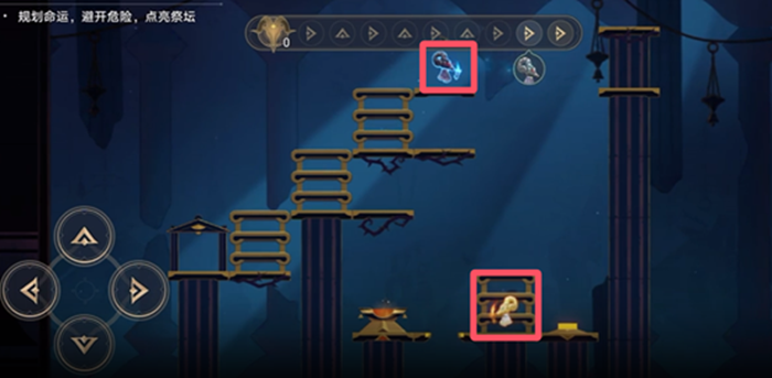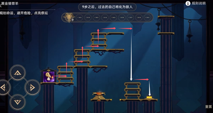 我们按照路线,依次按动右-上-右-上-右-上-右-右-右,来到这个位置,踩到机关按钮。图中的白线为自然下落,不用管。