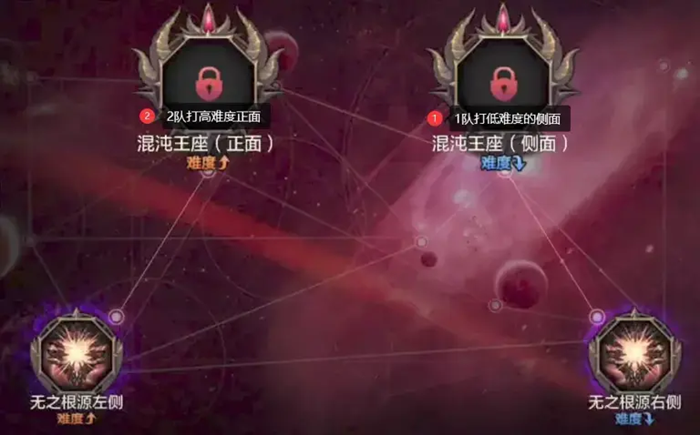 到了三阶段,队伍在通关下方两个“无根之源”后,建议1队挑战低难度的“混沌王座侧面”,而2队则面对高难度的“混沌王座正面”。低难度的侧面机制相对简单,能够让1队充分发挥实力进行输出;而2队的伤害相对较低,在高难度的正面挑战中只需努力生存即可。需要注意的是,两个房间的领主血量是共享的。