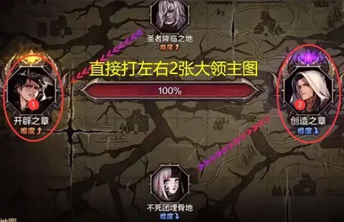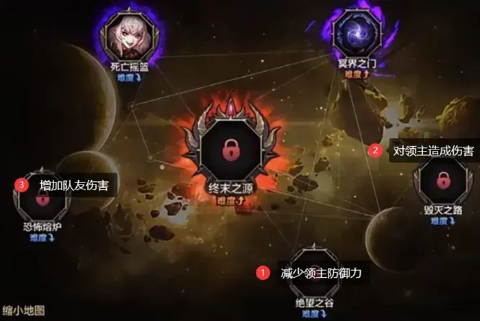1队进入“终末之源”后,2队需要不断重复挑战下方的三张BUFF图。比较合理的通关顺序是:先攻打下方的图以减少领主的防御力,接着攻打右侧的图对领主造成伤害,最后攻打左侧的图以增加队友的伤害。这样的顺序能够让1队的输出更加流畅。