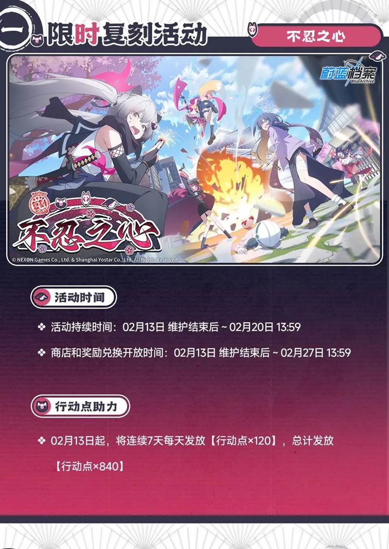 《蔚蓝档案》最新活动不忍之心即将复刻,听说百鬼夜行联合学院和歌赫娜学院即将举行一场交流会。「百鬼夜行」的阴阳部向老师发出委托,希望我们能维持本次活动的秩序。忍术研究部因废部危机也接受了委托和我们一起行动。本期我们为各位老师带来不忍之心活动的详细攻略,我们一起来看看。