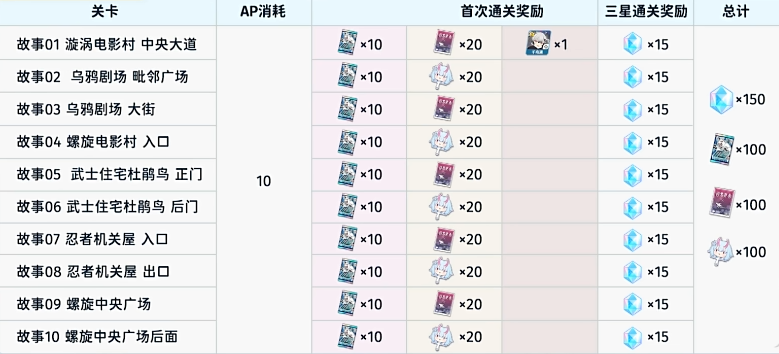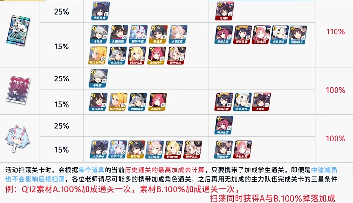 本次活动的任务关卡掉落情况与以往有所不同,任务 5 至任务 12 由于每 AP 掉落的材料比例较低,且没有神秘古物的掉落,所以高效益的主要扫荡关卡反而是最初始的 1 至 4 关,大家可别刷错了。活动的加成学生可以额外增加对应的掉落物,挑战关将在活动的第二天解锁,完成所有关卡可获得 300 青辉石。