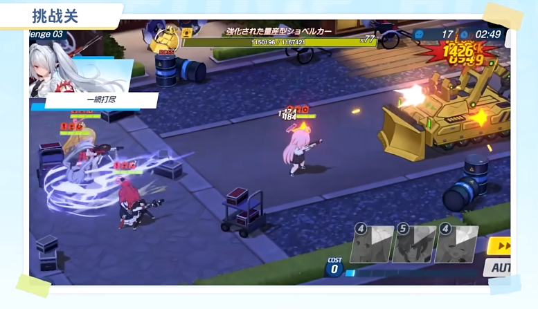 挑战的第三关考验单体贯通输出,我们将要面对 116 万血、3520 点防御的强化量产型挖土机,该 BOSS 拥有两个技能,第一个技能会猛击地面,造成大范围伤害并再次提高自身的防御力,同时对我方全体学生施加受到的治疗效果降低;