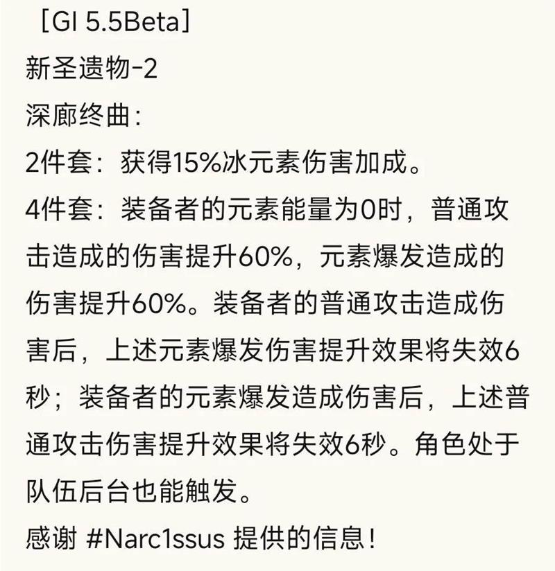 至于第二套圣遗物,那就真的是新冰套了,它的二件套效果能够提升角色15%的冰元素伤害,而四件套效果则是当装备者的元素能量为零时,普通攻击造成的伤害提升60%,元素爆发造成伤害提升60%。