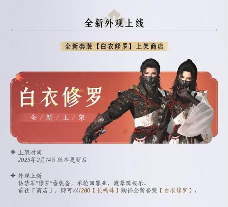 2月14日更新后,游侠即可前往「商店」,以1280「长鸣珠」购得全新套装【白衣修罗】。