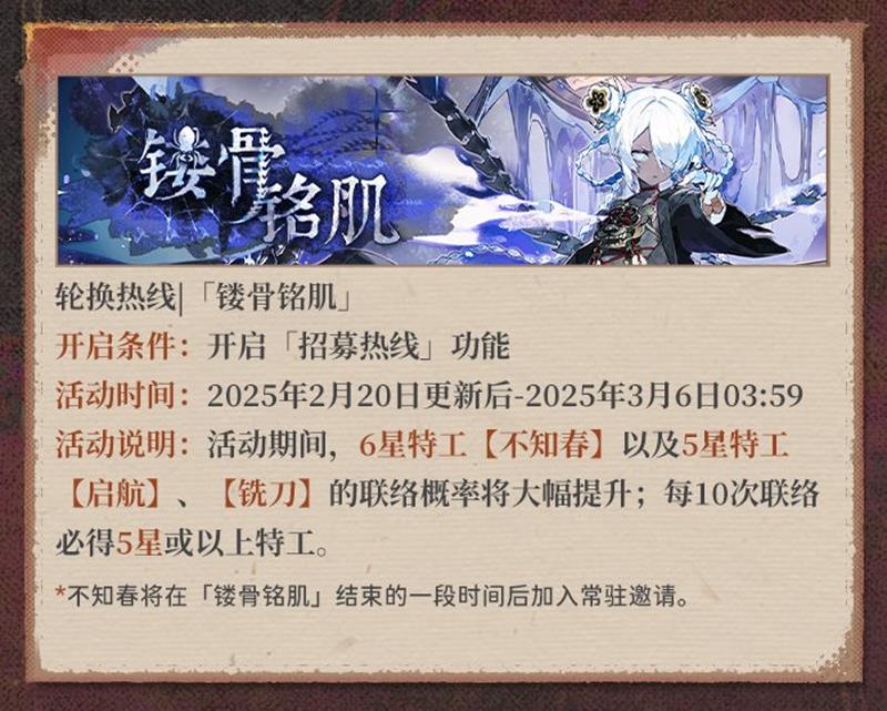 根据官方公告,不知春将会在2025年2月20日正式加入游戏。届时将会开启「镂骨铭肌」轮换招募热线,不知春将会加入卡池且获得概率UP。在卡池结束一段时间之后,不知春将会加入常驻池。