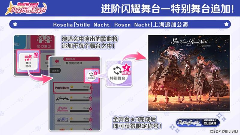 完成全舞台★3演出,还可获得Roselia「Stille Nacht, Rosen Nacht」上海追加公演开展纪念称号。同时官方还宣布,该追加公演实装后将会常驻,各位可以不用担心限时以及过期的问题了!