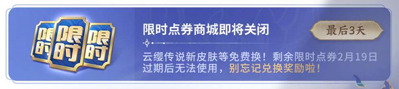 云缨传说新皮肤等免费换!剩余限时点券2月19日 过期后无法使用,别忘记兑换奖励啦!