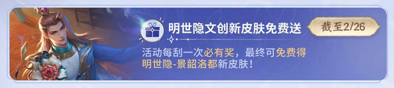 活动每刮一次必有奖,最终可免费得 明世隐-景韶洛都新皮肤!