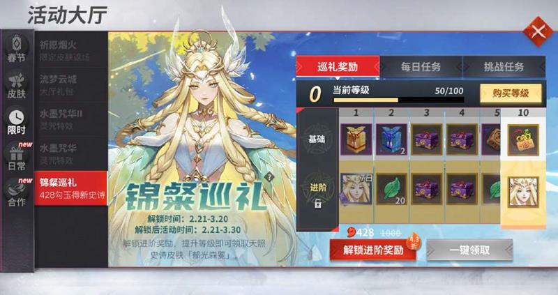 活动期间通过完成任务获取经验值提升等级,即可获取免费线奖励;更可花费428勾玉解锁付费线,获得天照史诗皮肤「郁光森冕」。