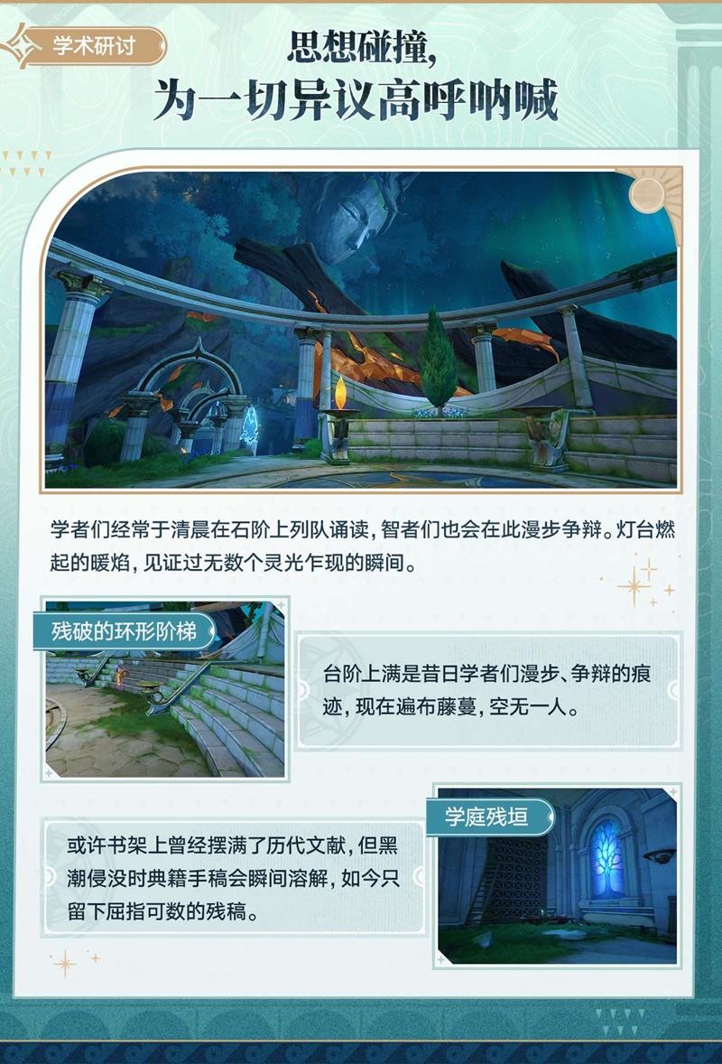 学术研究,思想碰撞,为一切异议高呼呐喊。学者们经常于清晨在石阶上列队诵读,智者们也会在此漫步争辩。灯台燃起的暖焰,见证过无数个灵光乍现的瞬间。残破的环形阶梯,台阶上满是昔日学者们漫步、争辩的痕迹,现在遍布藤蔓,空无一人。学庭残垣或许书架上曾经摆满了历代文献,但黑潮侵没时典籍手稿会瞬间溶解,如今只留下屈指可数的残稿。
